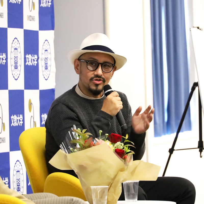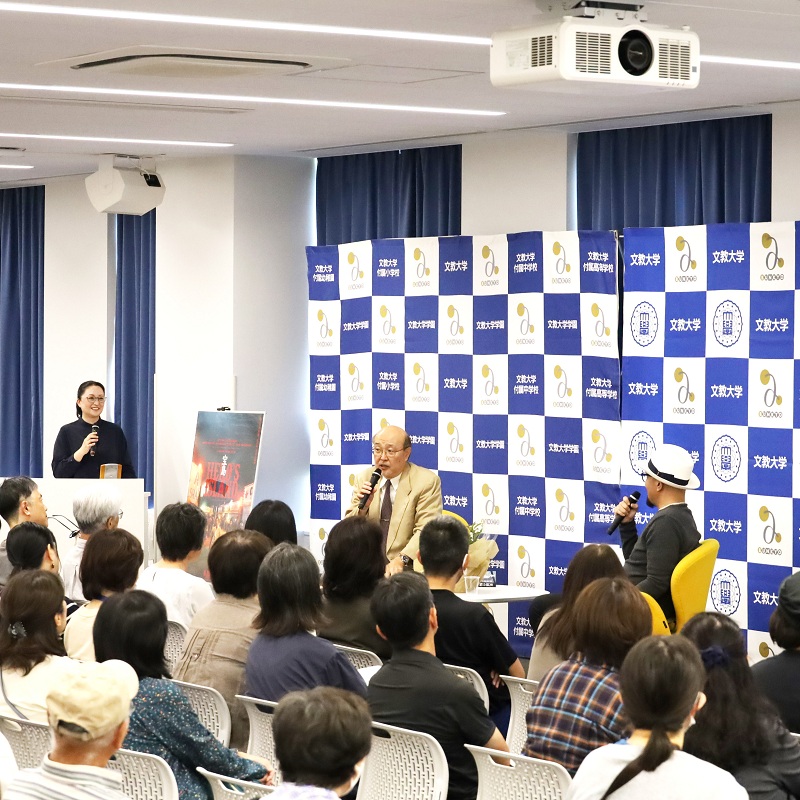 また、映画「宝島」公開記念「真藤順丈氏トークイベント」では、フリーアナウンサーの八木田幸恵さん(人間科学部卒業生)の進行のもと、原作者で文学部日本語日本文学科卒業の直木賞作家・真藤順丈さんと文学部日本語日本文学科教授で恩師の寺澤浩樹先生との対談が行われ、真藤さんの学生時代のエピソードや直木賞受賞作品で原作の小説『宝島』が映画化に至るまでのお話などを、和やかな雰囲気でお話いただきました。