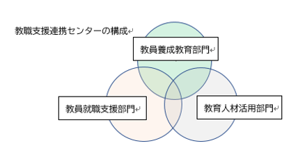 教職支援連携センターは「教員養成教育部門」「教員就職支援部門」「教育人材活用部門」の3つの部門からなり、「教育人材活用部門」は本学卒業生を中心とする現職教員との関係づくりや、大学周辺の教育機関ならびに地域との教育・研究支援及び連携に取組みます。